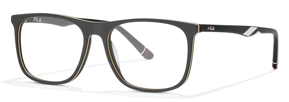 Explore FILA eyeglasses: medium square plastic frames in charcoal gray with stylish side accents. Fusing Italian influence with a legacy in refined sports apparel and accessories, they embody contemporary style and functionality effortlessly.